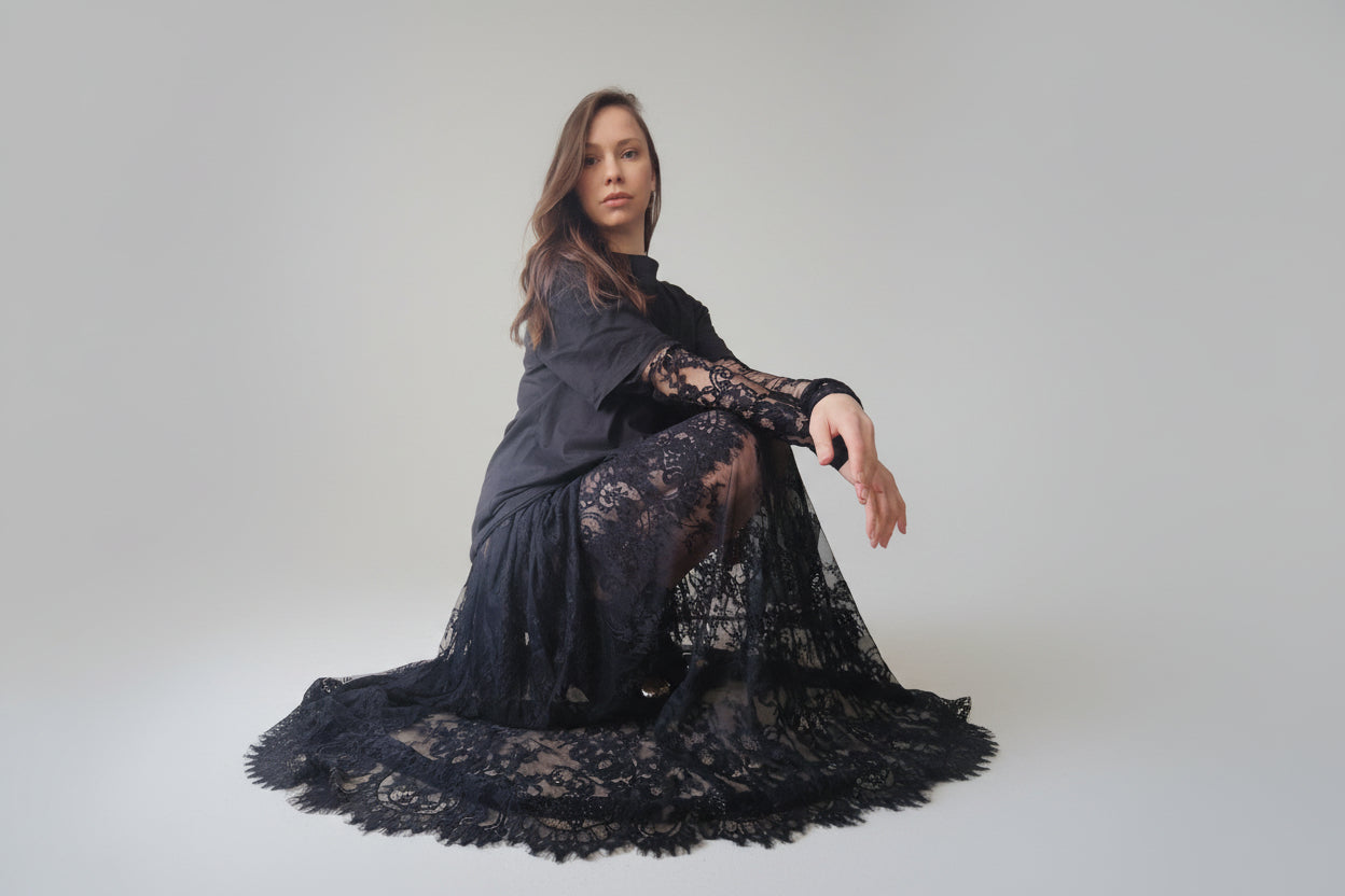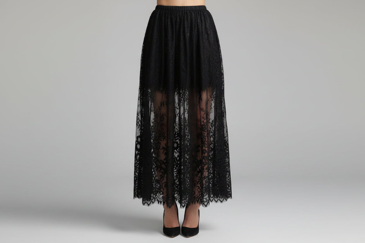 Lang blondeskjørt i transparent materiale med innvendig volang. Elastisk linning for god komfort. Underskjørtet er laget av tre lag med delikat guipure-blonde, som gir skjørtet ekstra volum og et eksklusivt uttrykk.