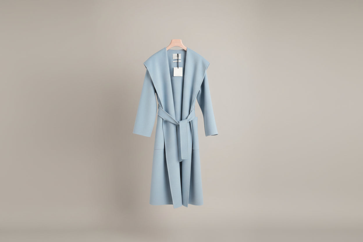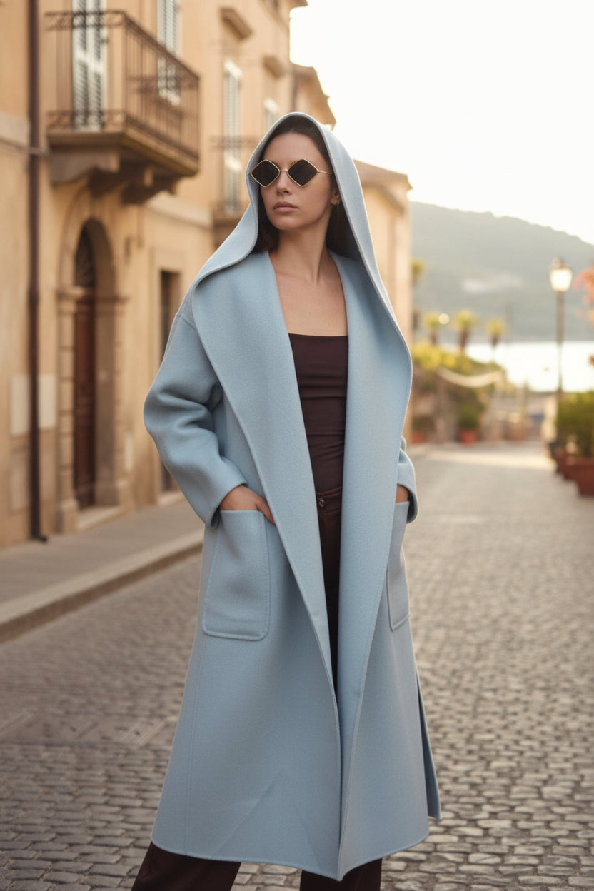 Ullkåpe i morgenkåpe-stil, håndlaget av det italienske merket Vicolo. Kåpen har en støv- og vannavstøtende effekt og kommer med en dyp, voluminøs hette. Fremhev silhuetten med det medfølgende beltet. Den lave skuldersømmen gir et mykt og feminint uttrykk, mens de forsterkede ermene gir ekstra komfort.