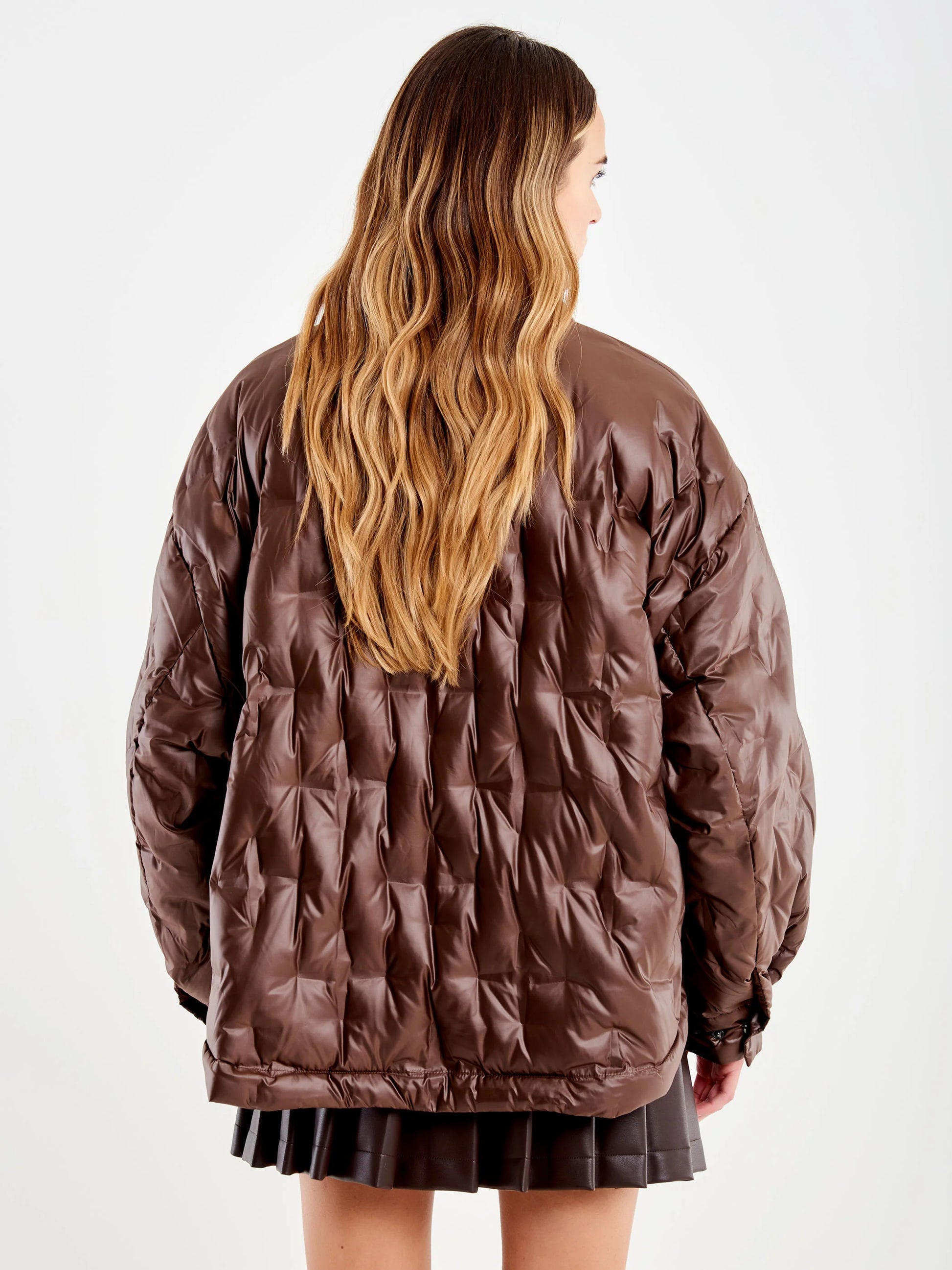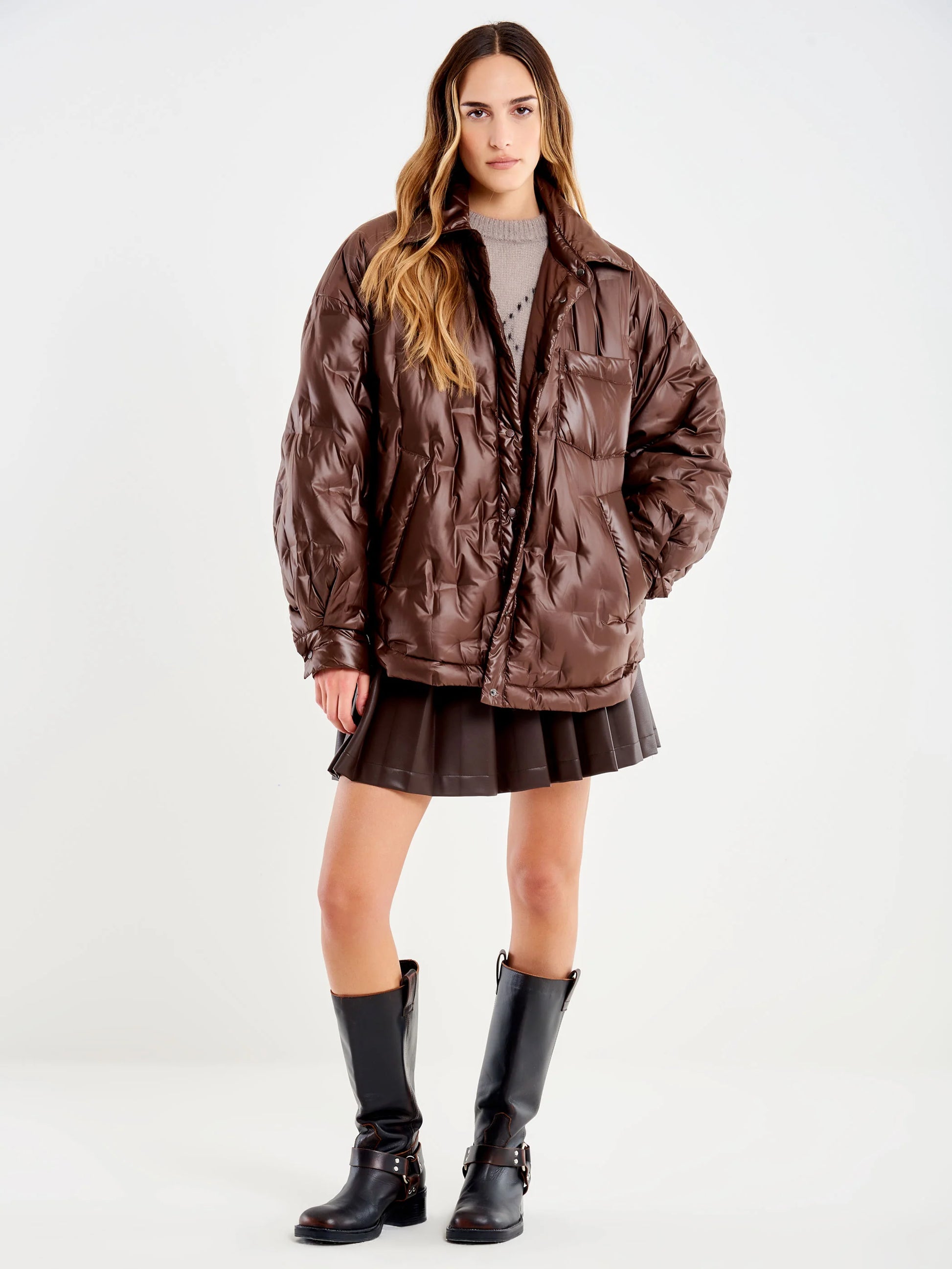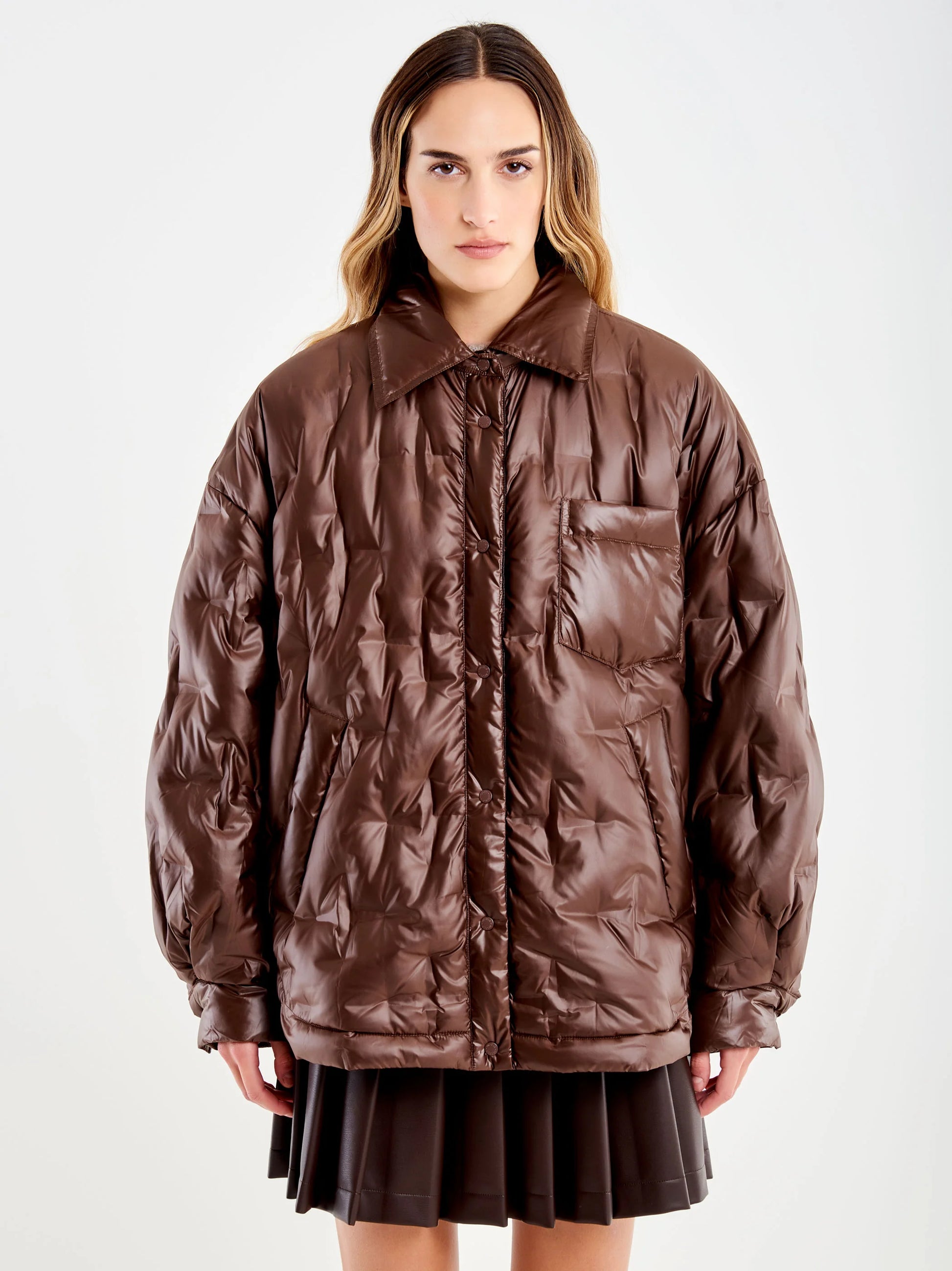 Motemerket Vicolo. Vattert skjortejakke med krage og lange ermer. Lukking foran med trykknapper. Geometriske vatteringsdetaljer. Trykknapper på ermene. Skrålommer i sidene og brystlomme.