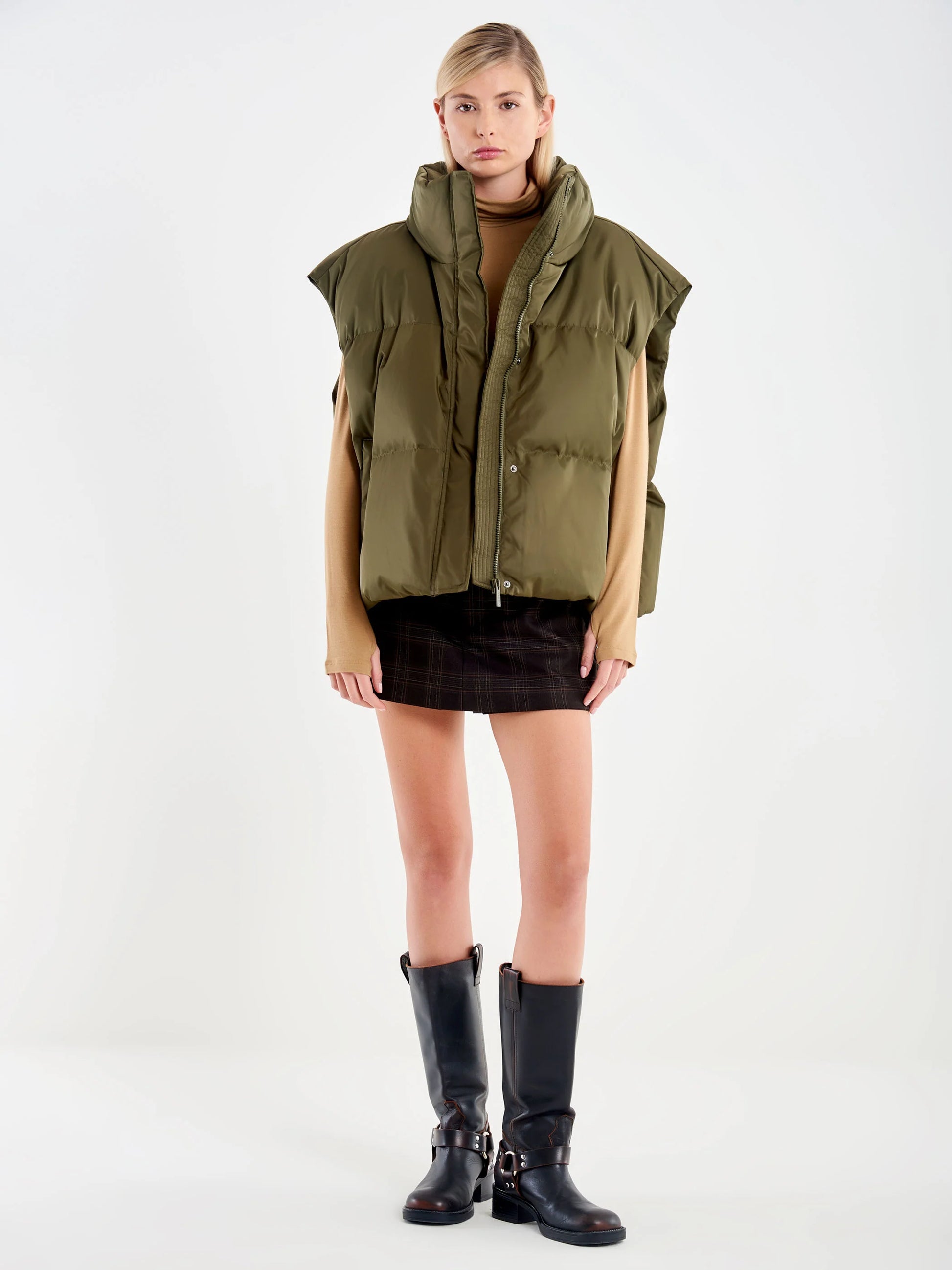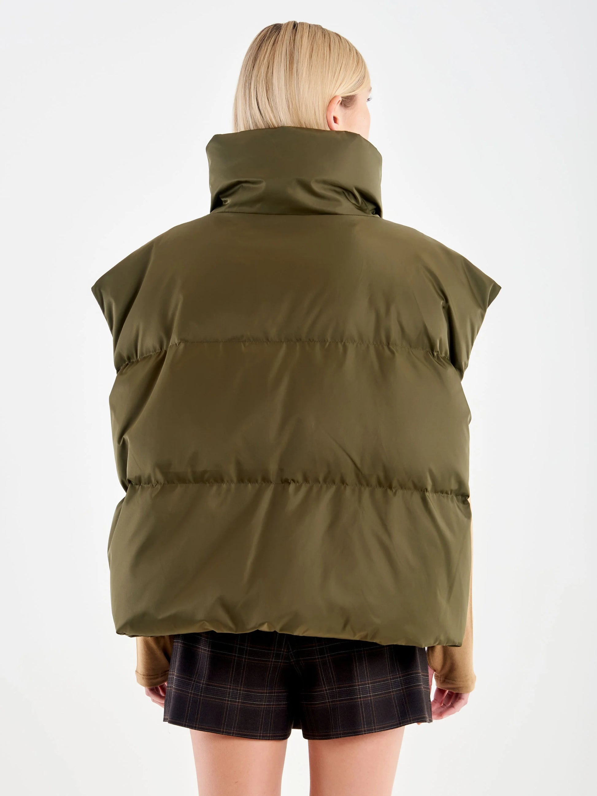 Overdimensjonert vattert vest i teknisk stoff. Lukking foran med metallglidelås og trykknapper. Skrålommer i sidene. Høy krage.