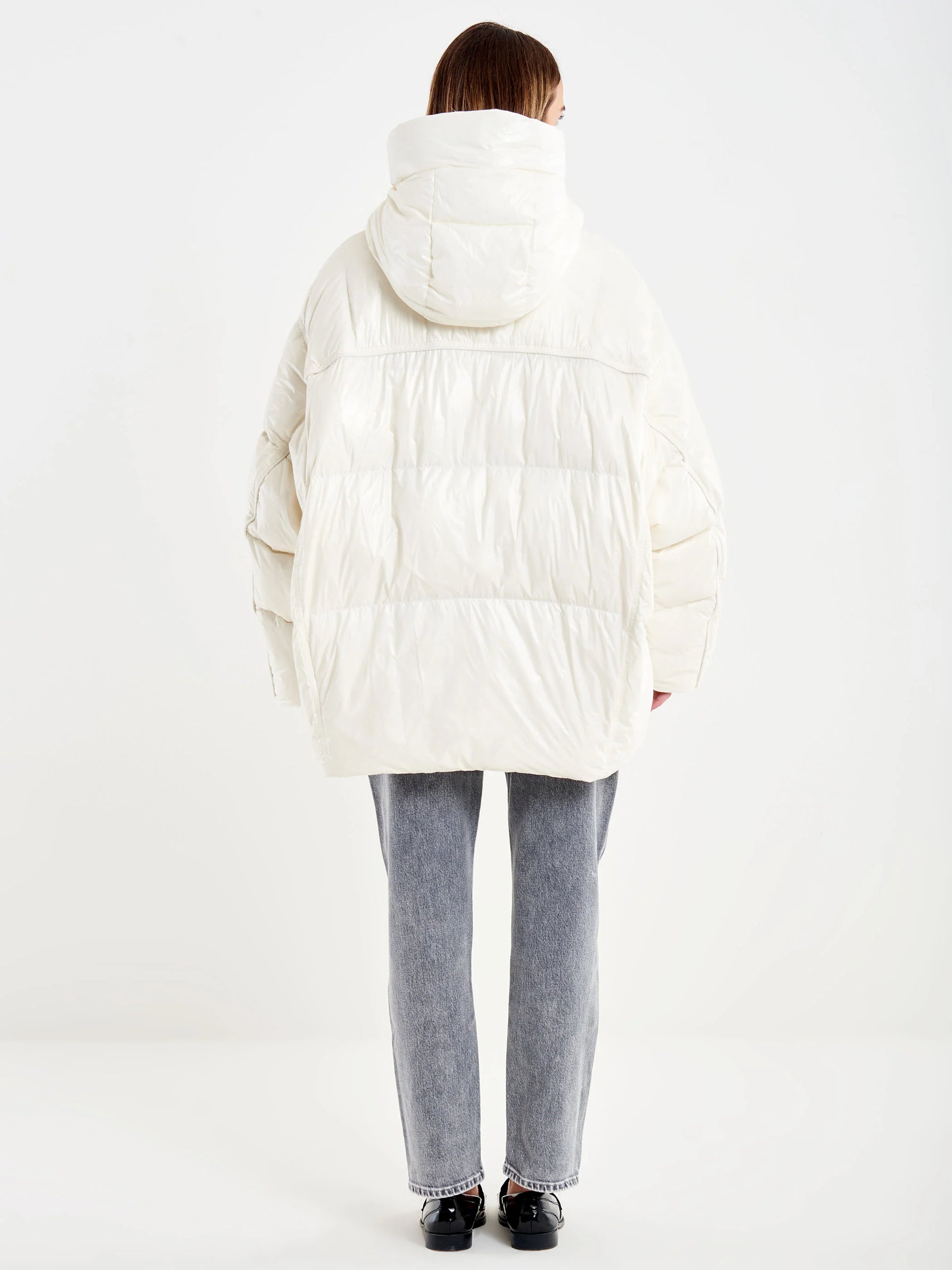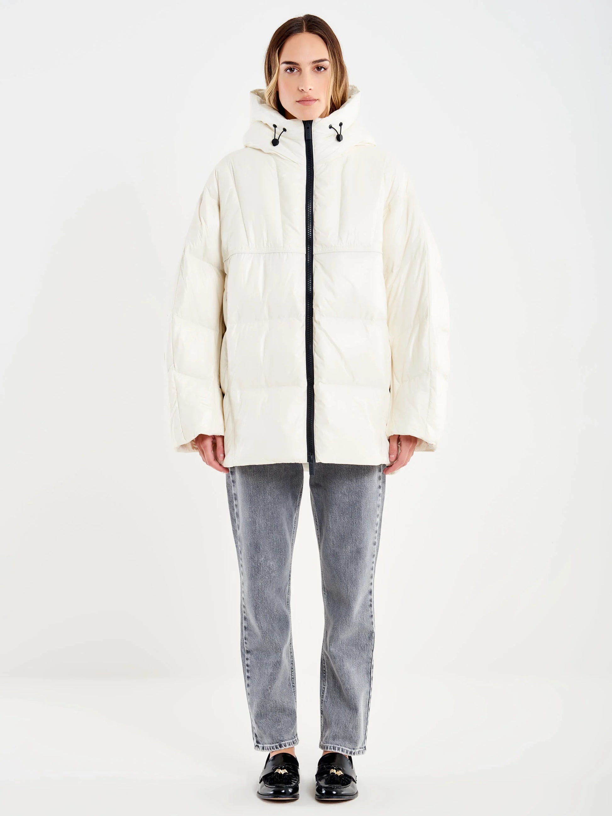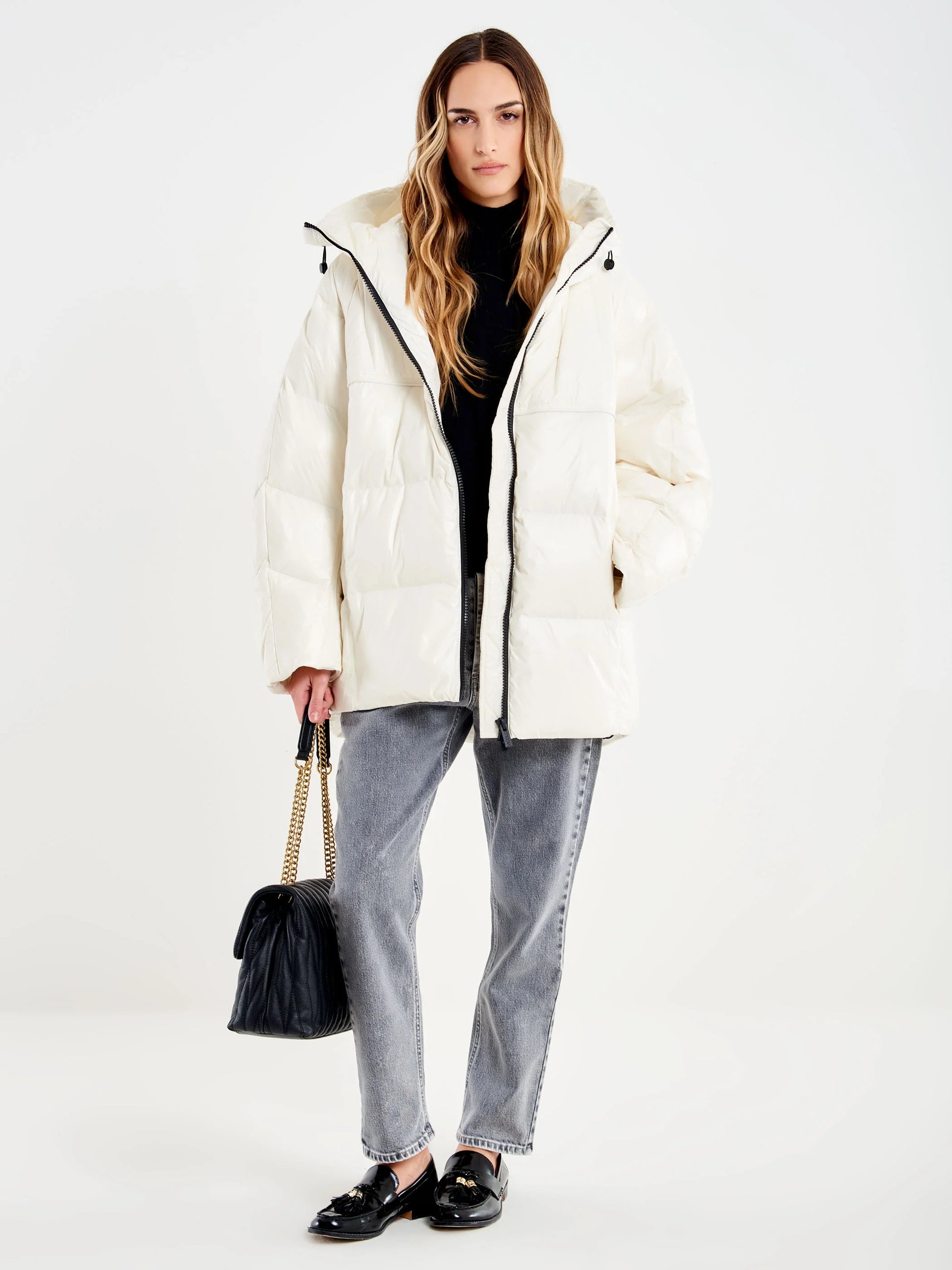 Dunjakke i midi-lengde med ballongsnitt og lange ermer. Hetten gir et moderne uttrykk. Kontrasterende glidelåslukking foran.