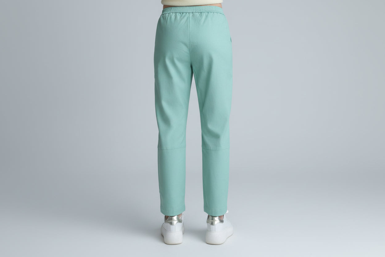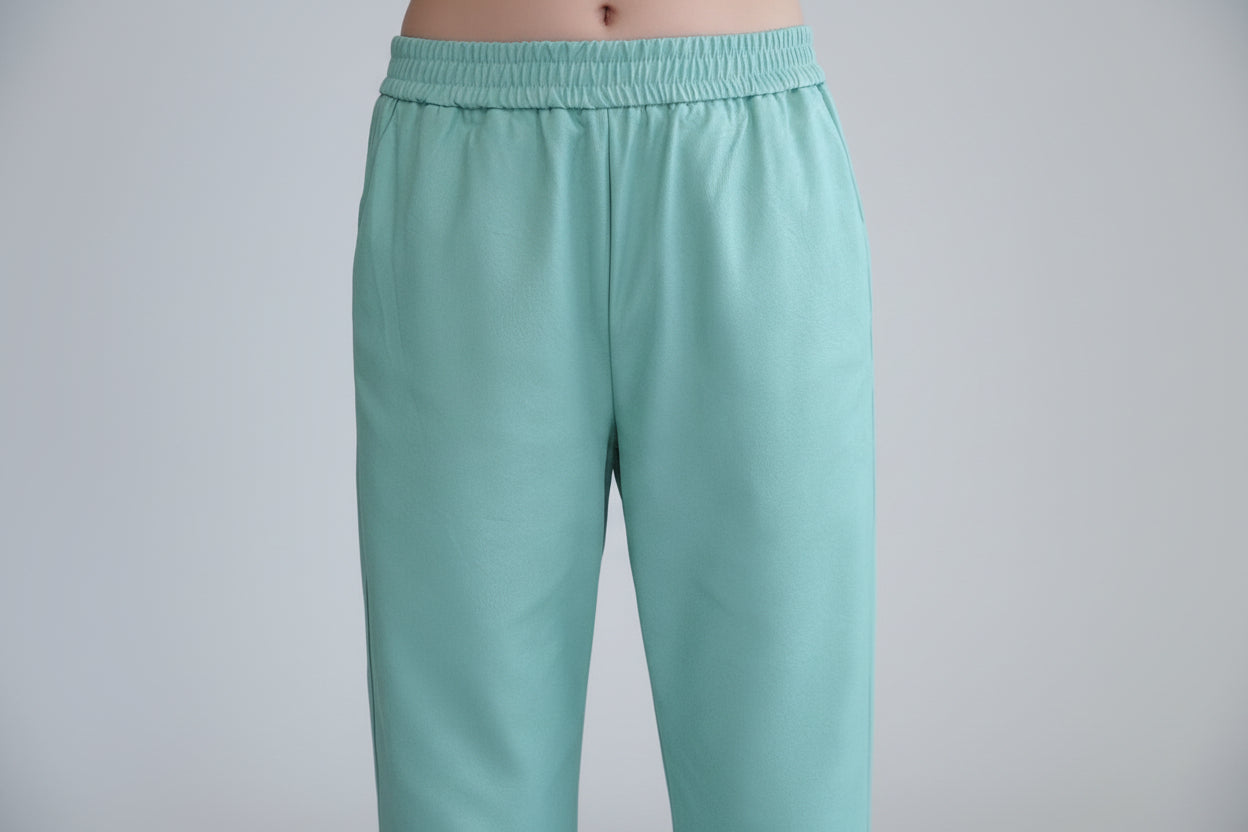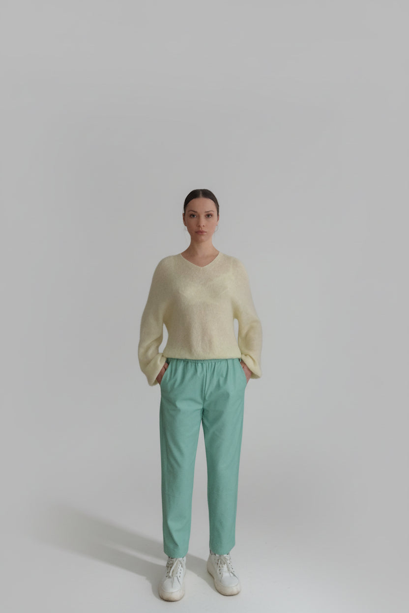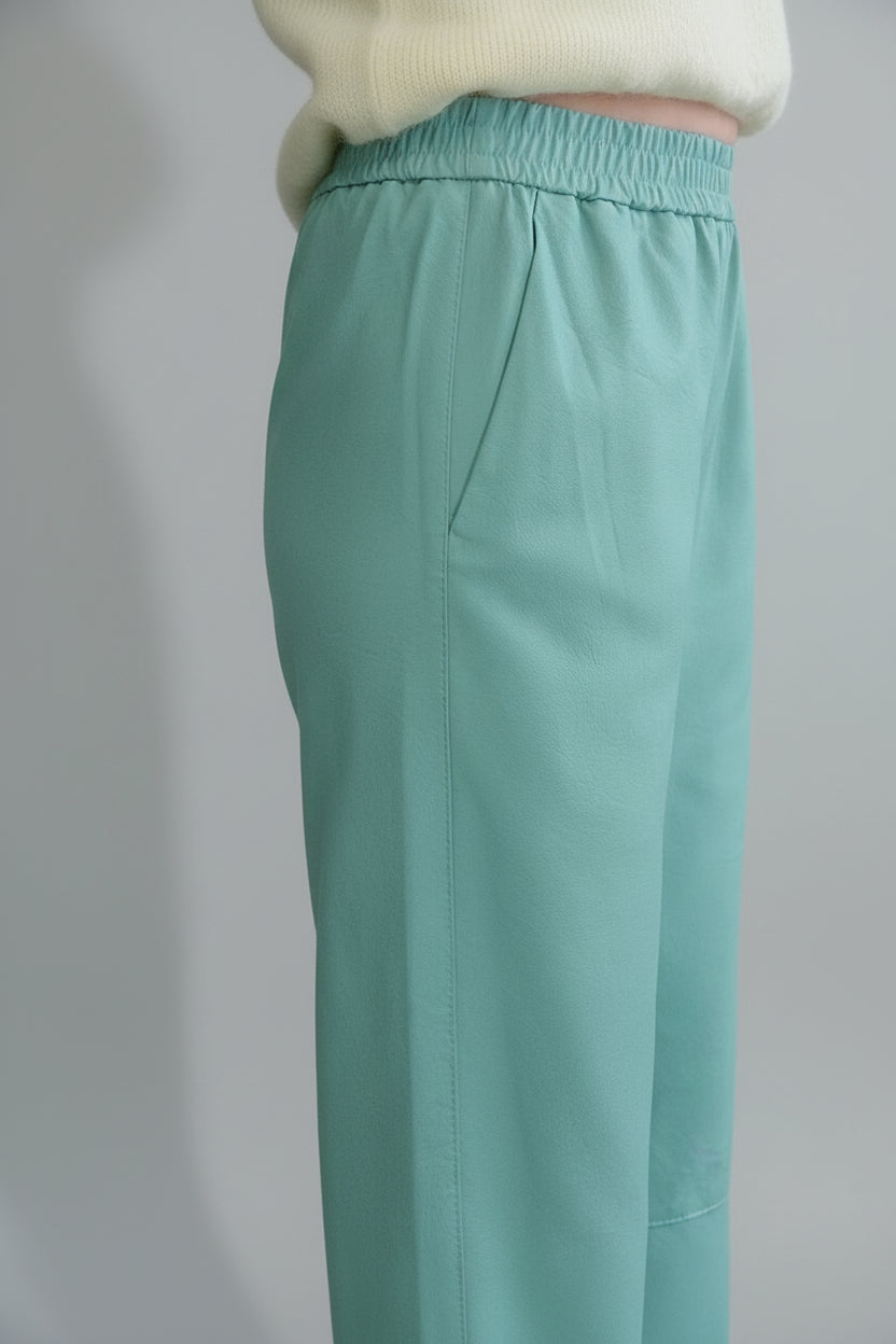 Bukser fra den nye kolleksjonen til det italienske merket Vicolo. Laget av svært mykt og høykvalitets, pustende kunstskinn med behagelig mikrofiber på innsiden. Elastisk linning for god komfort. Med lommer. En ny modell i sesongens trendy Tiffany-farge.