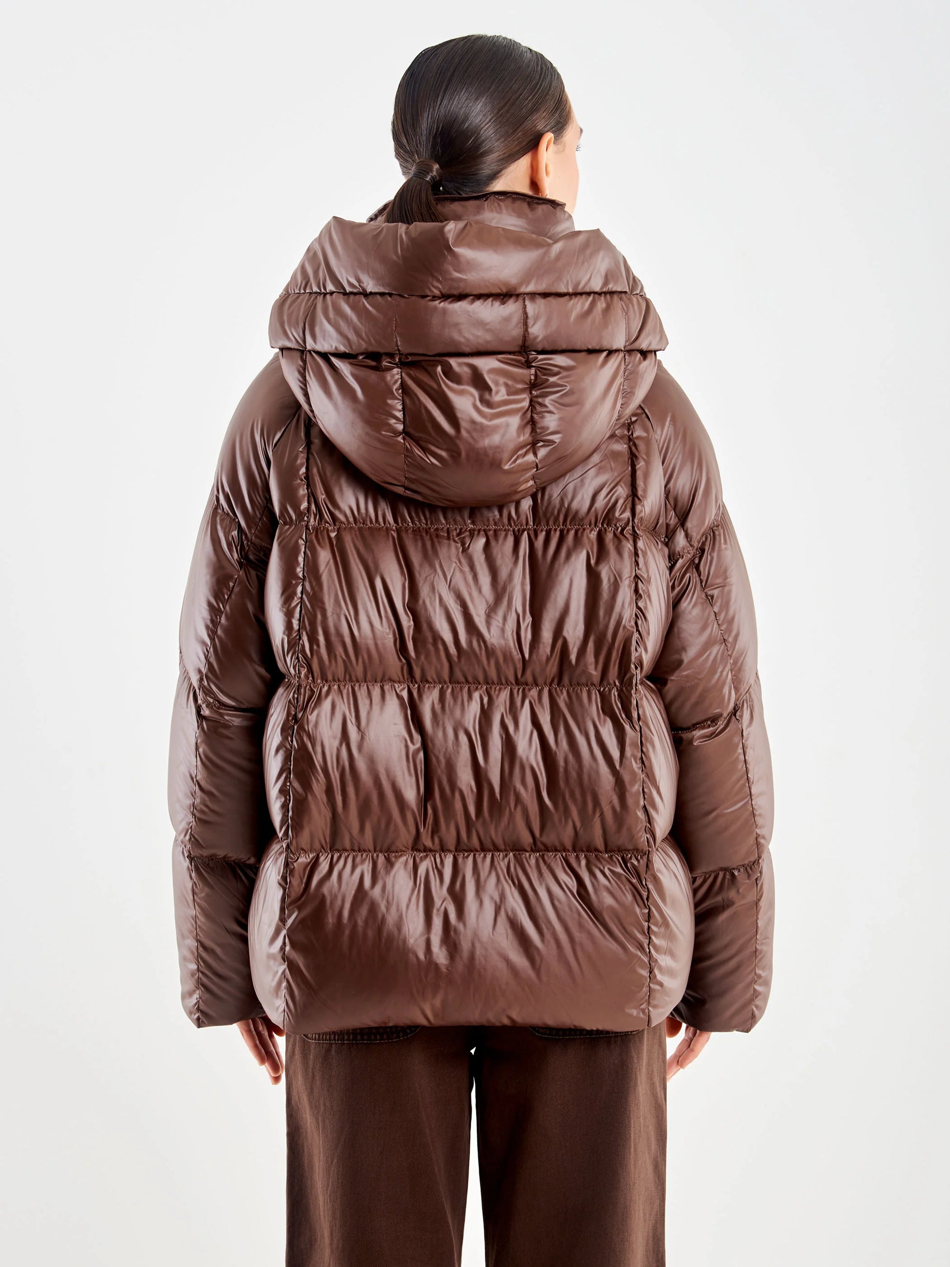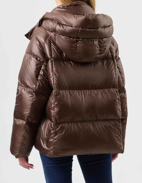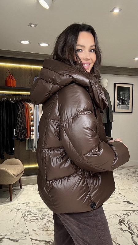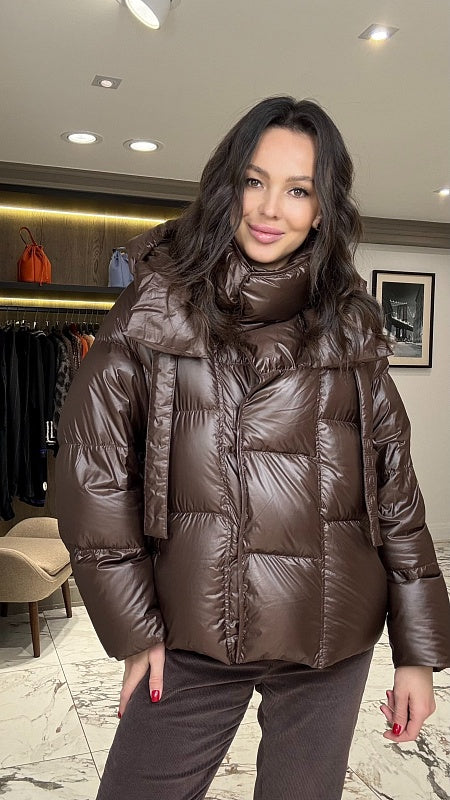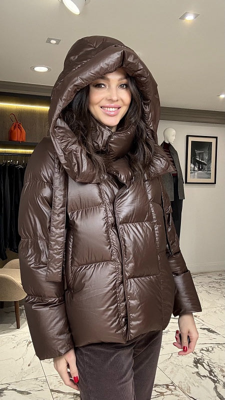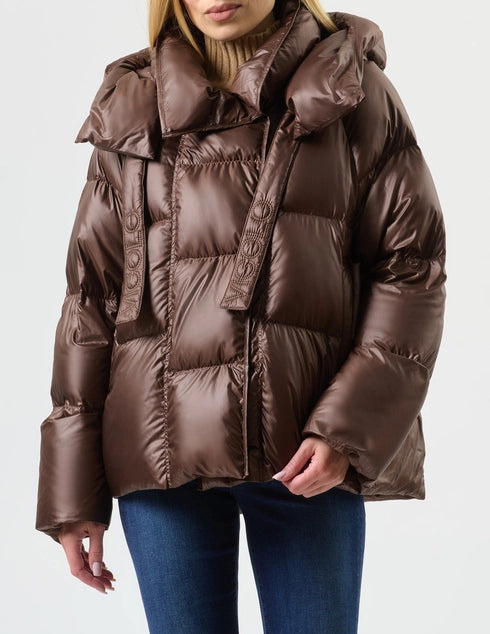 Kort, langermet dunjakke med maxi-hette. Lukking foran med magnetknapper. Maxi-hette med snøring og Vicolo-logo. Skrålommer i sidene.