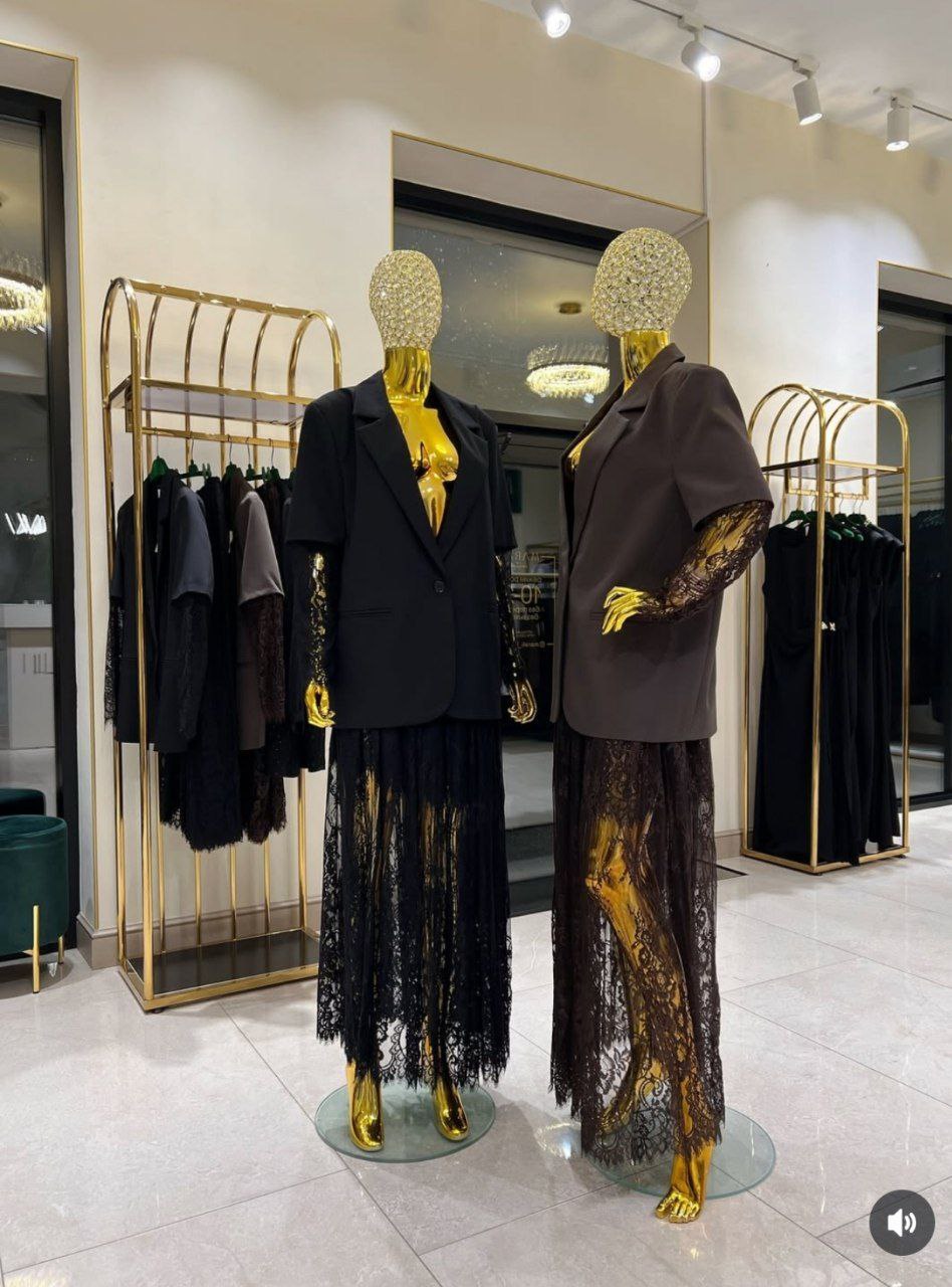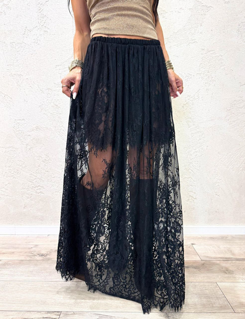 Langt blondeskjørt i gjennomsiktig materiale med innvendig volang. Elastisk midje.