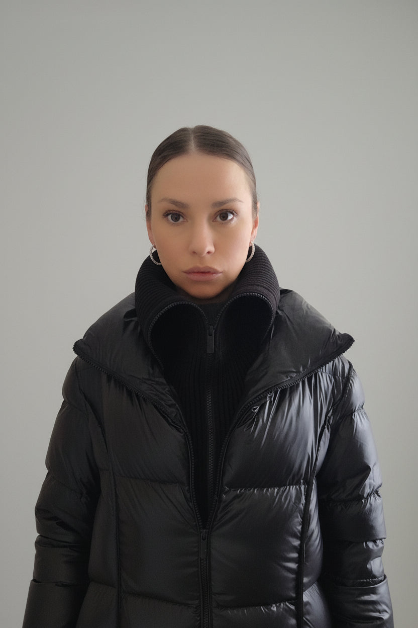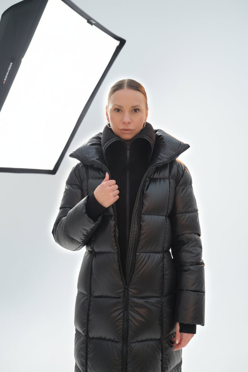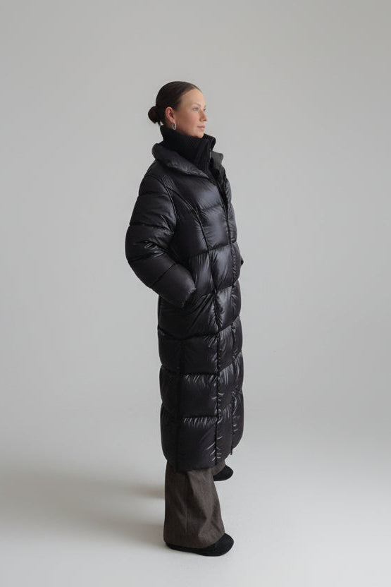 En elegant og funksjonell lang dunjakke, designet for kalde vinterdager uten å gå på kompromiss med stil.