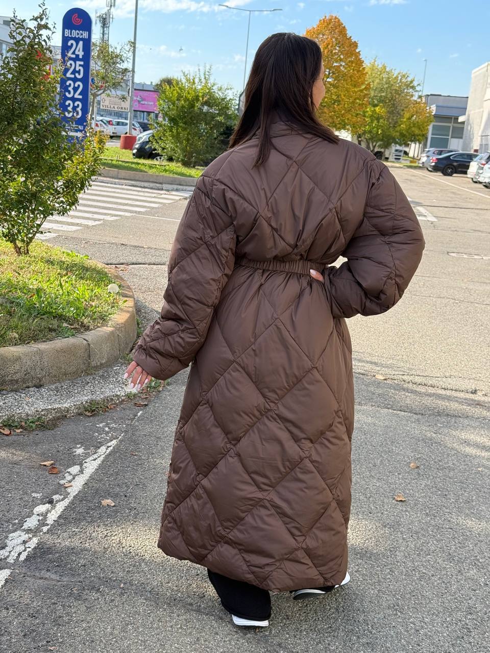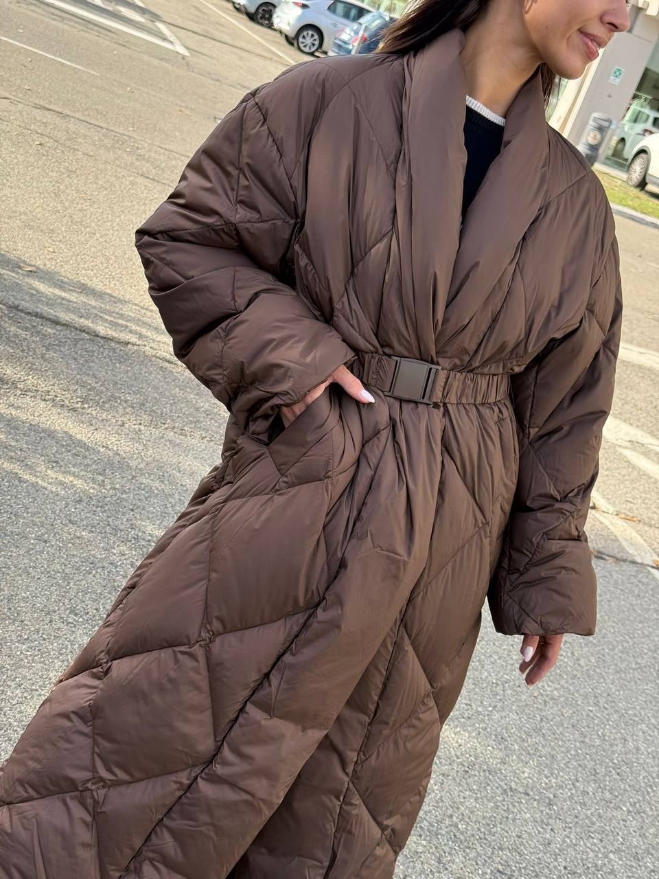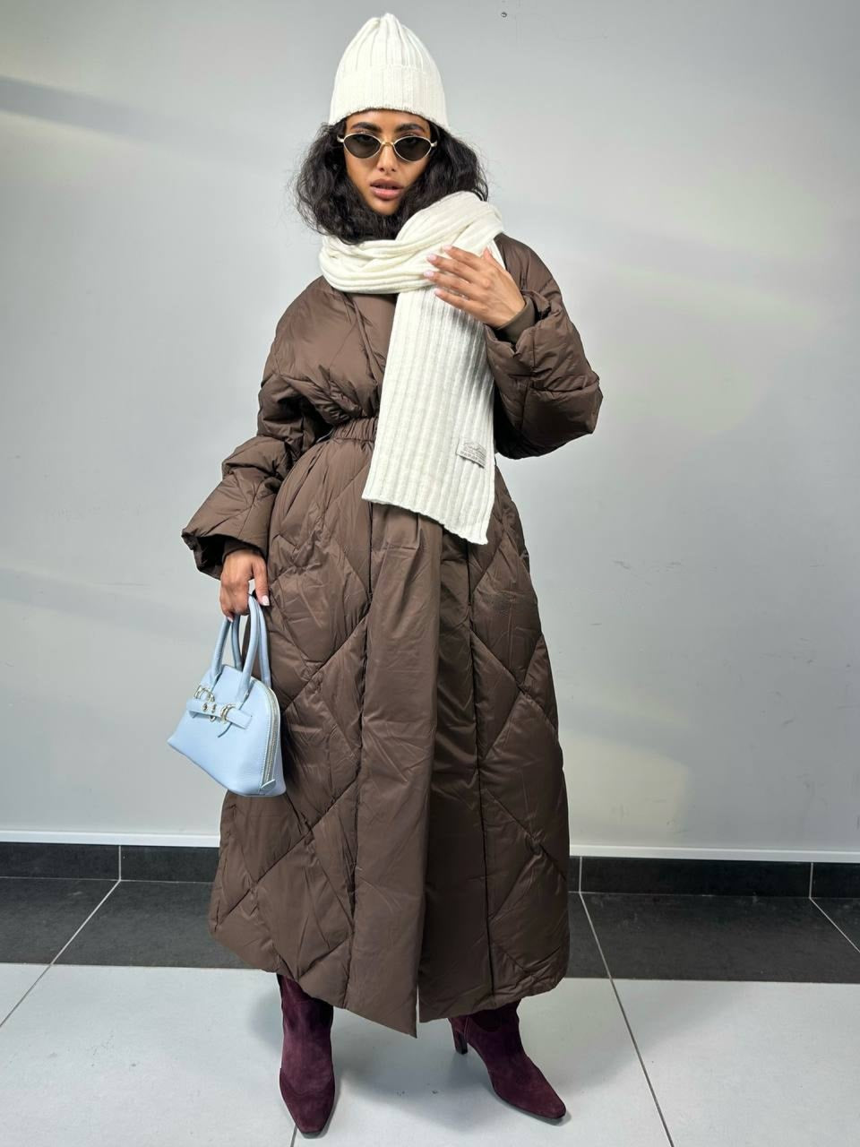 La vinteren møte luksus. Denne lange, ultralette dunjakken kombinerer varme og sofistikert design i én perfekt silhuett. Det brede beltet markerer midjen og skaper en feminin form, mens de quiltede sømmene gir et eksklusivt uttrykk.