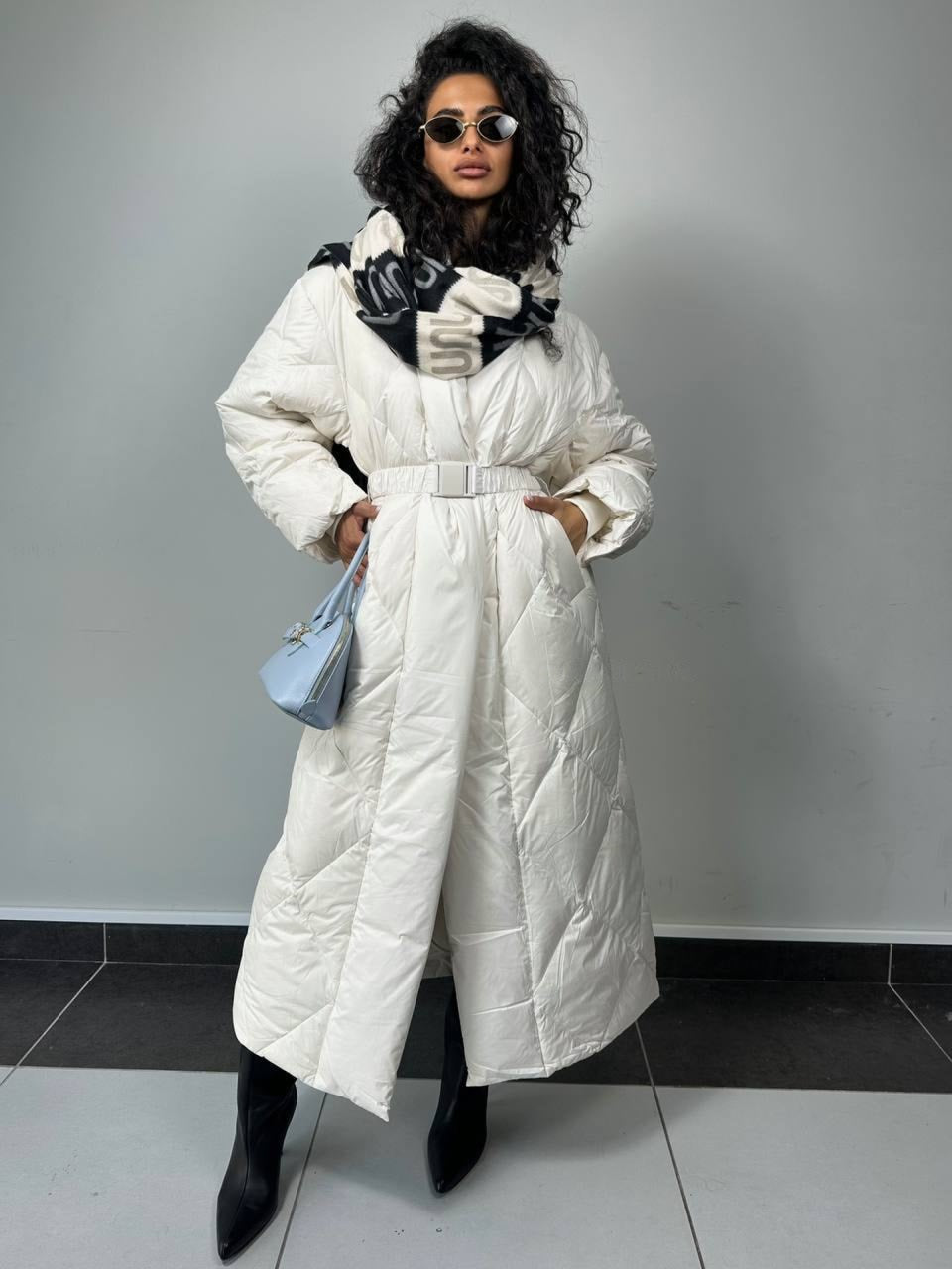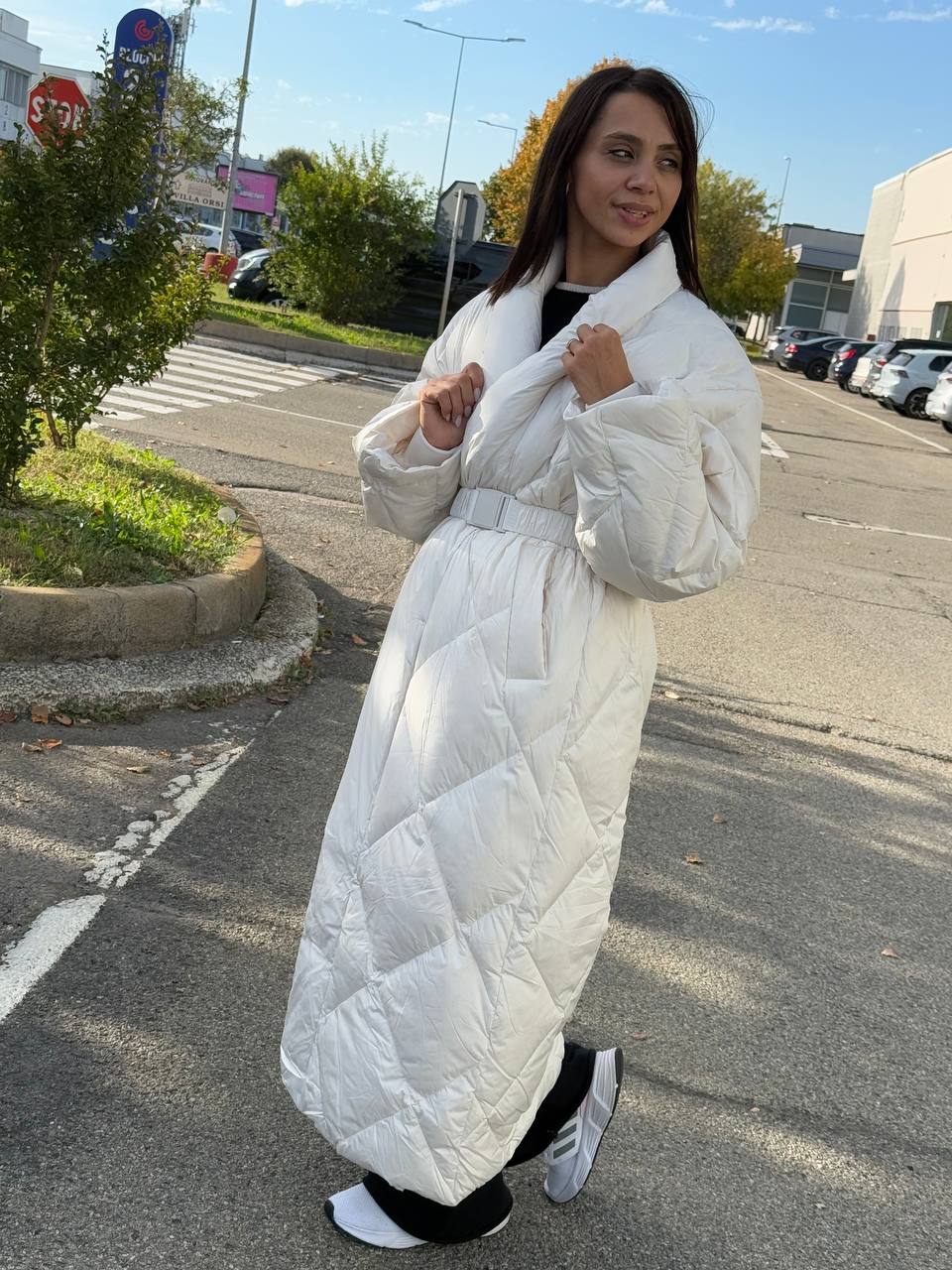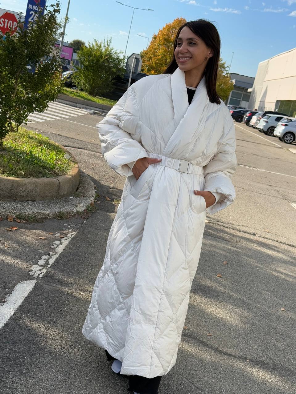 La vinteren møte luksus. Denne lange, ultralette dunjakken kombinerer varme og sofistikert design i én perfekt silhuett. Det brede beltet markerer midjen og skaper en feminin form, mens de quiltede sømmene gir et eksklusivt uttrykk.