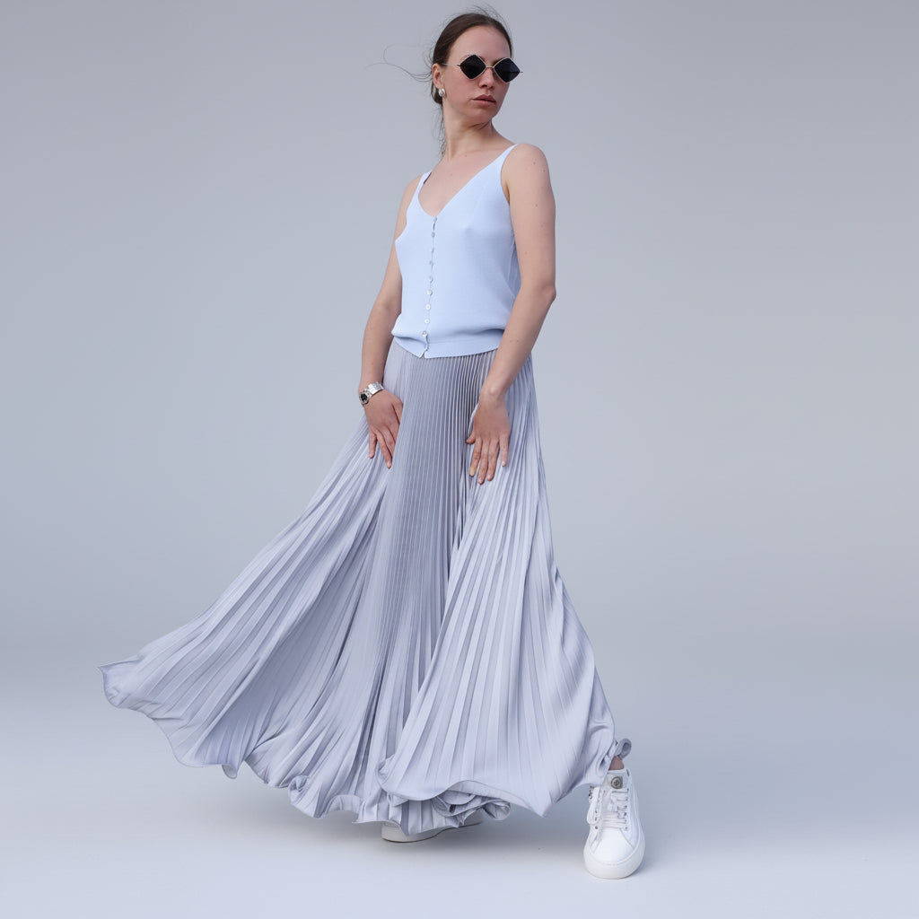 Langt plissert skjørt i satengstoff. Lukkes med glidelås bak. De fremtredende vertikale foldene skaper en strømlinjeformet silhuett, noe som gjør den ideell for sofistikert og moderne styling. Passer for de som søker særegne detaljer og et personlig uttrykk i garderoben sin.