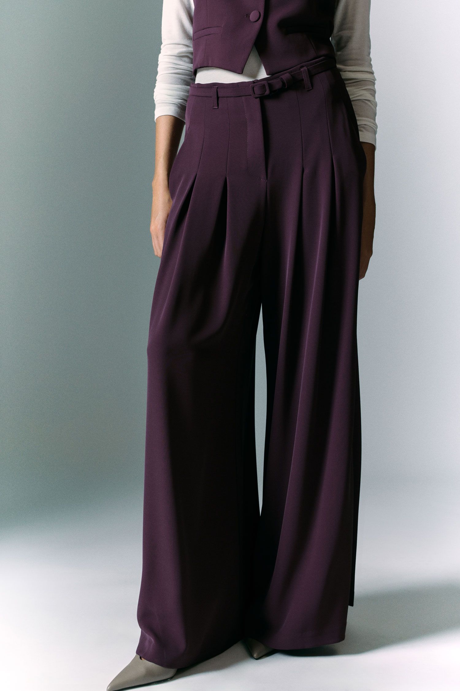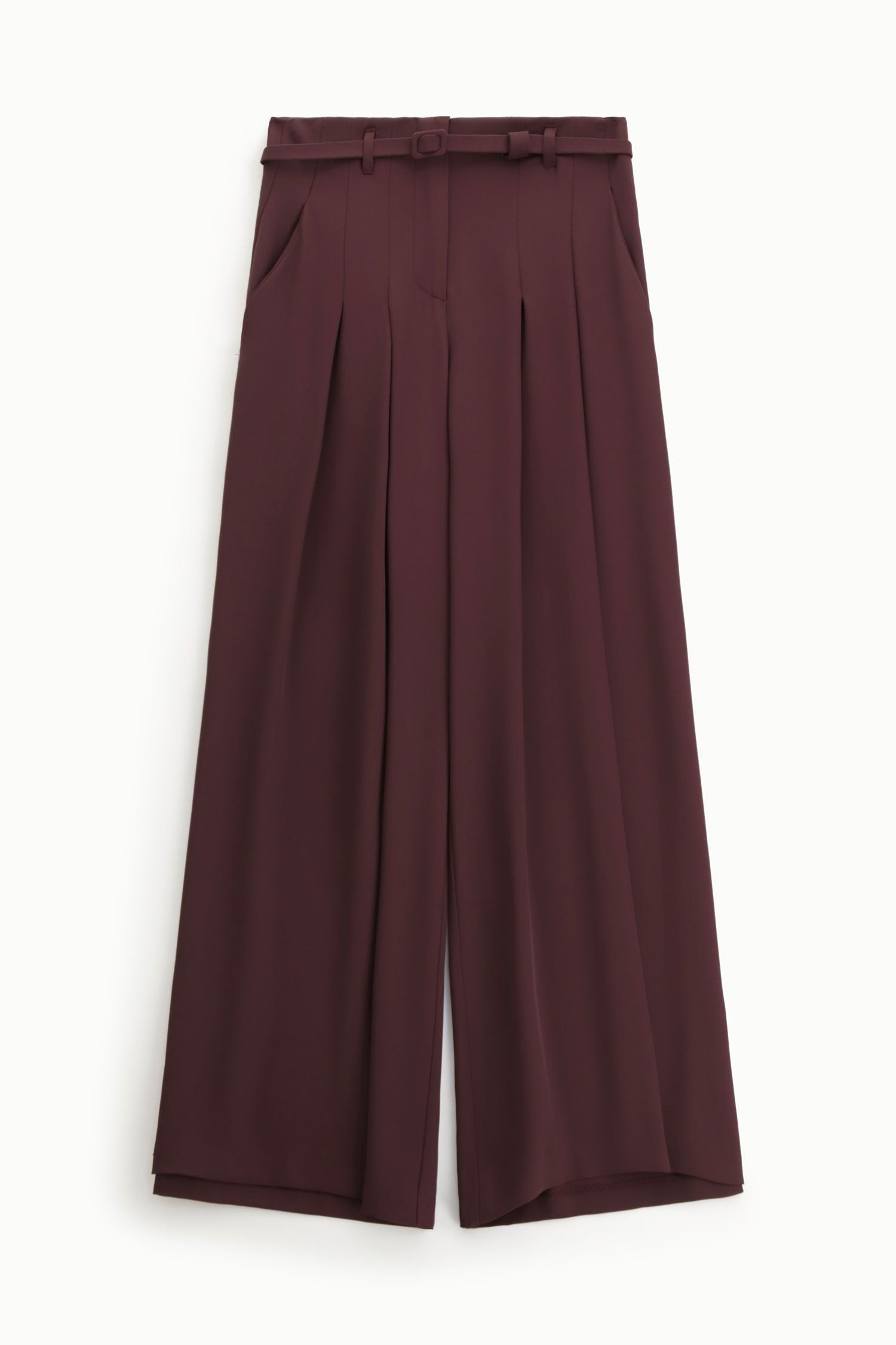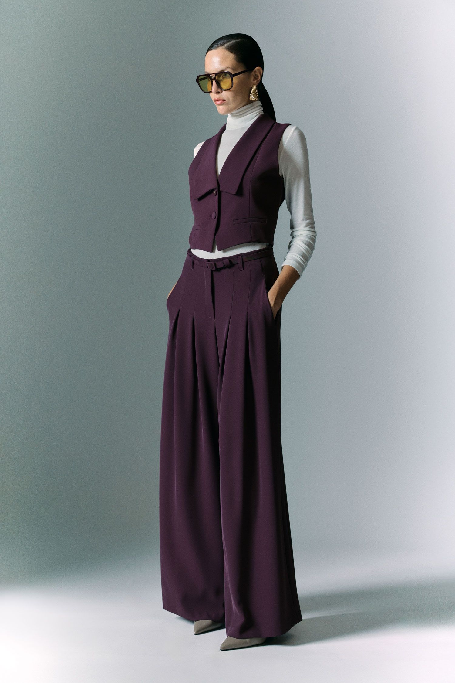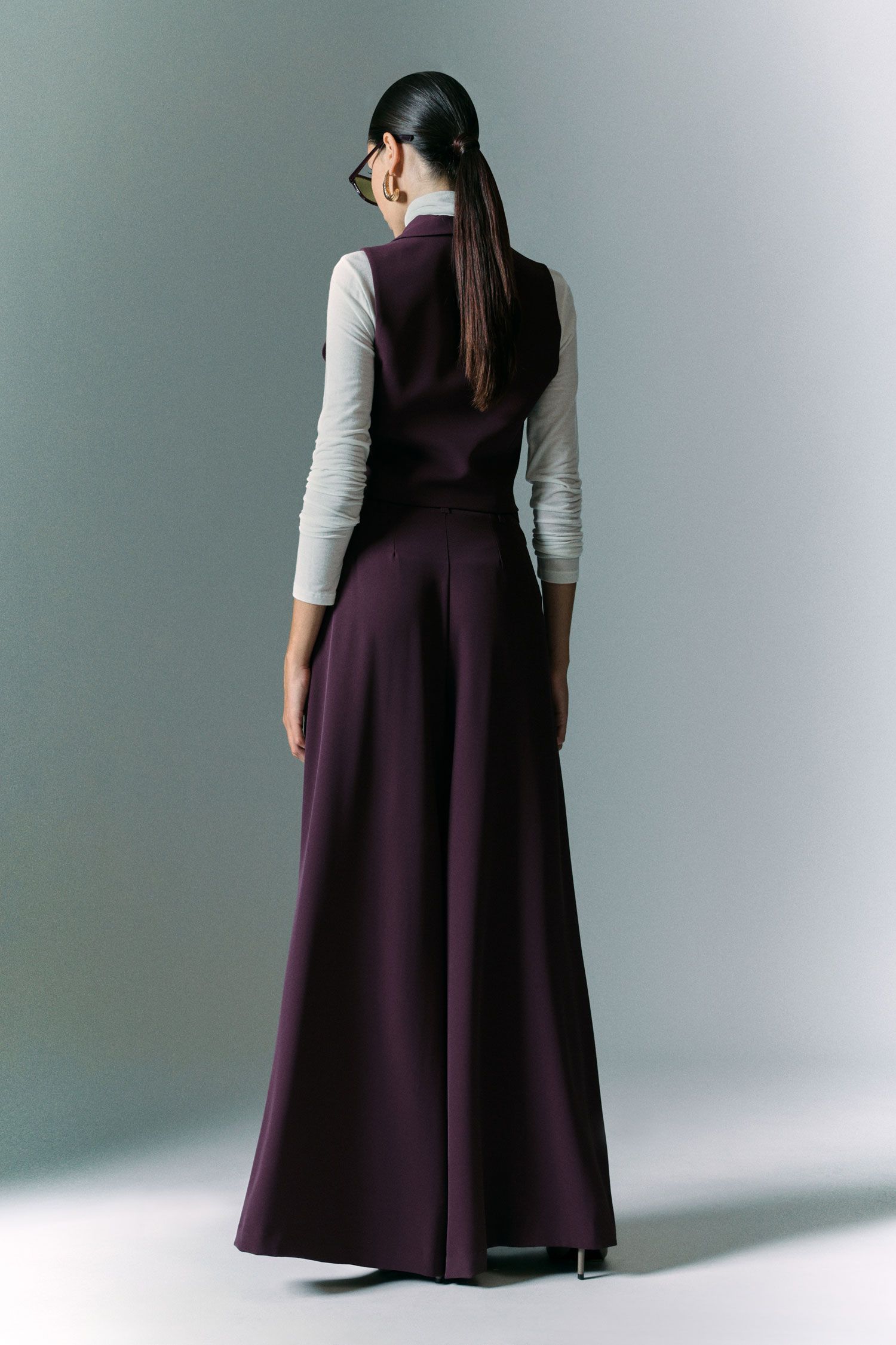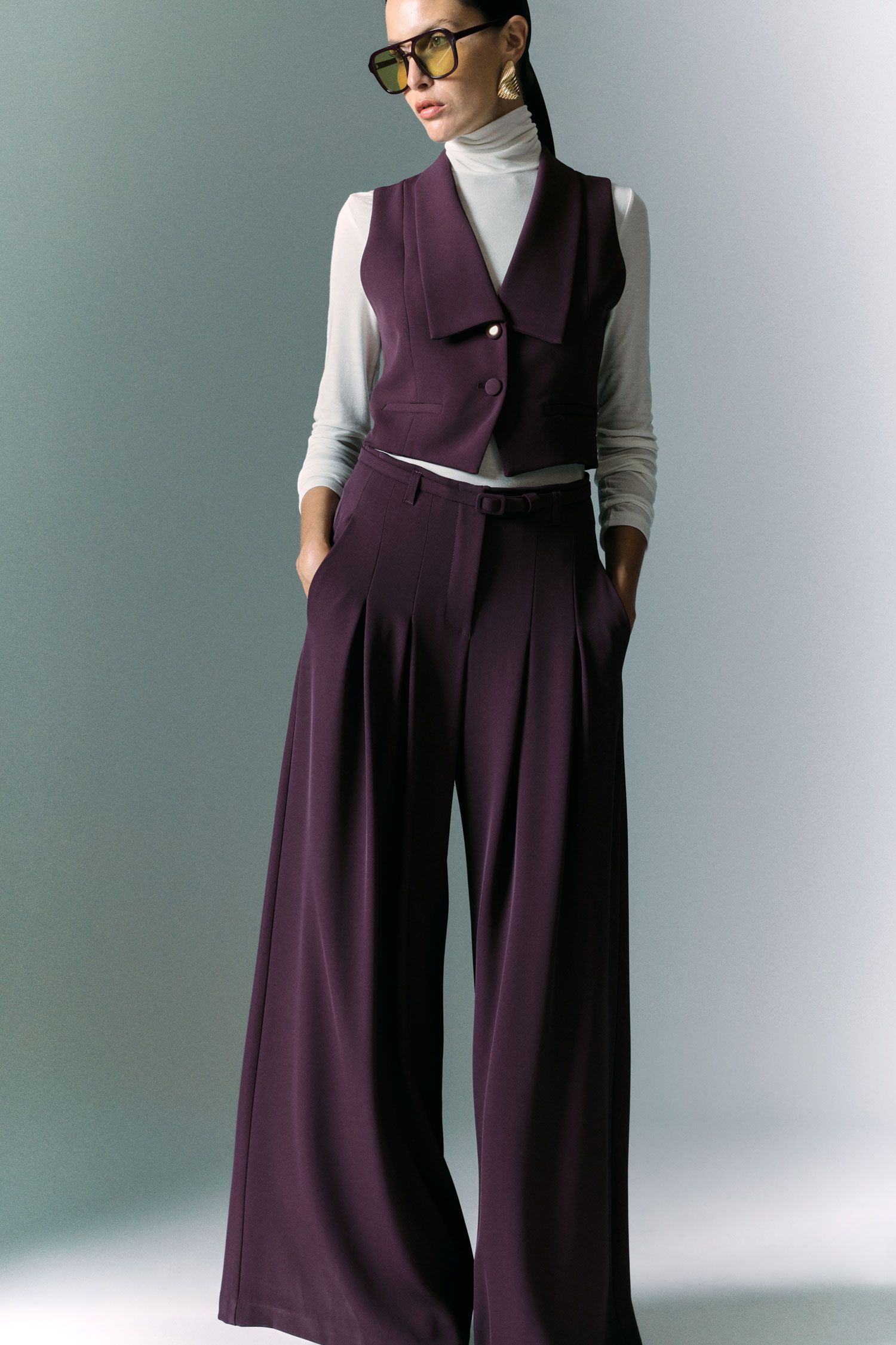 Palazzobukse med høyt liv og en vid, sofistikert silhuett. Frontleggene gir buksen struktur og definisjon, mens den lange passformen fremhever elegansen i snittet. Perfekt for å skape et personlig og særpreget uttrykk takket være mange kombinasjonsmuligheter og et bredt fargeutvalg.
