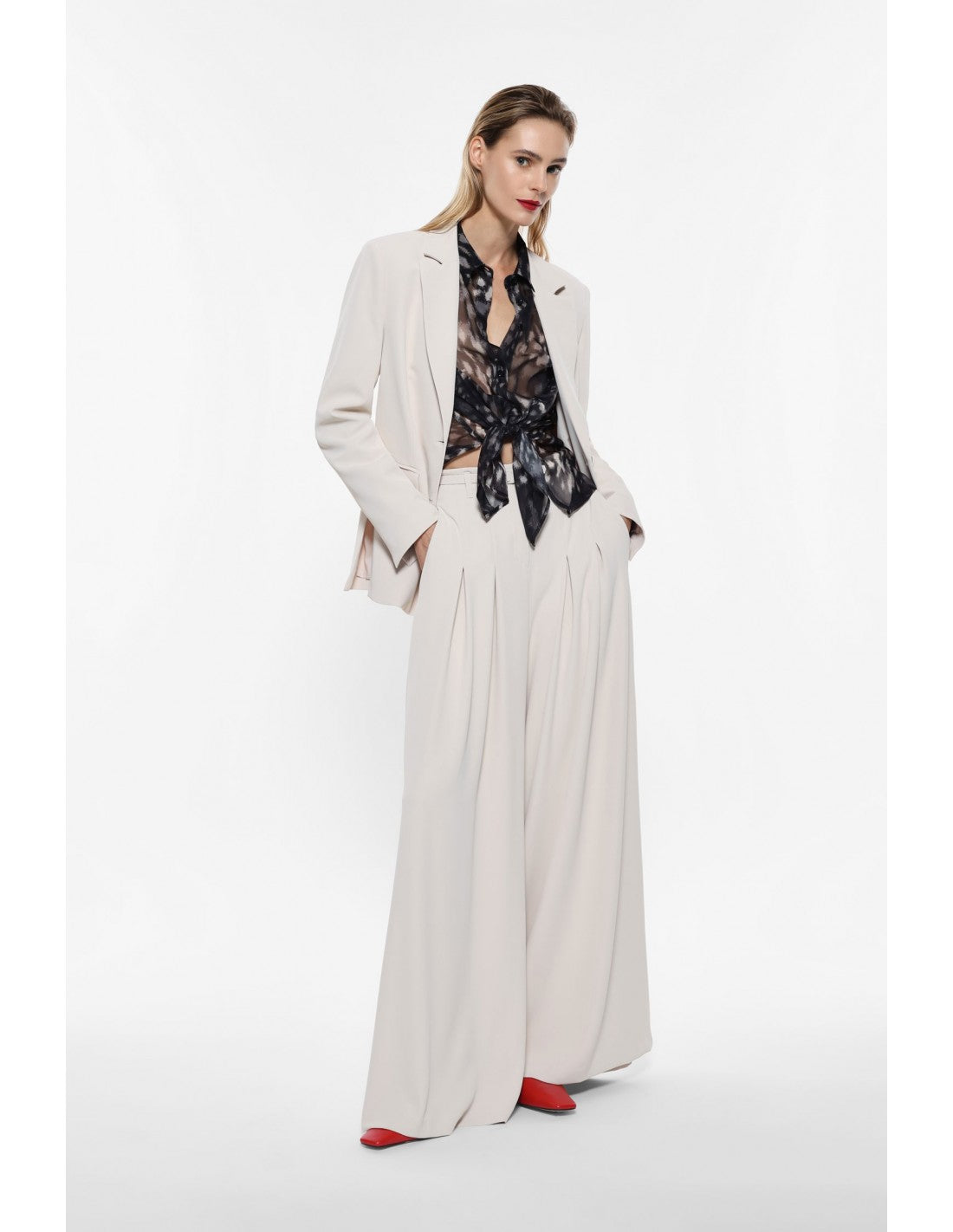 Palazzobukse med høyt liv og en vid, sofistikert silhuett. Frontleggene gir buksen struktur og definisjon, mens den lange passformen fremhever elegansen i snittet. Perfekt for å skape et personlig og særpreget uttrykk takket være mange kombinasjonsmuligheter og et bredt fargeutvalg.