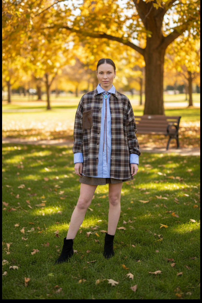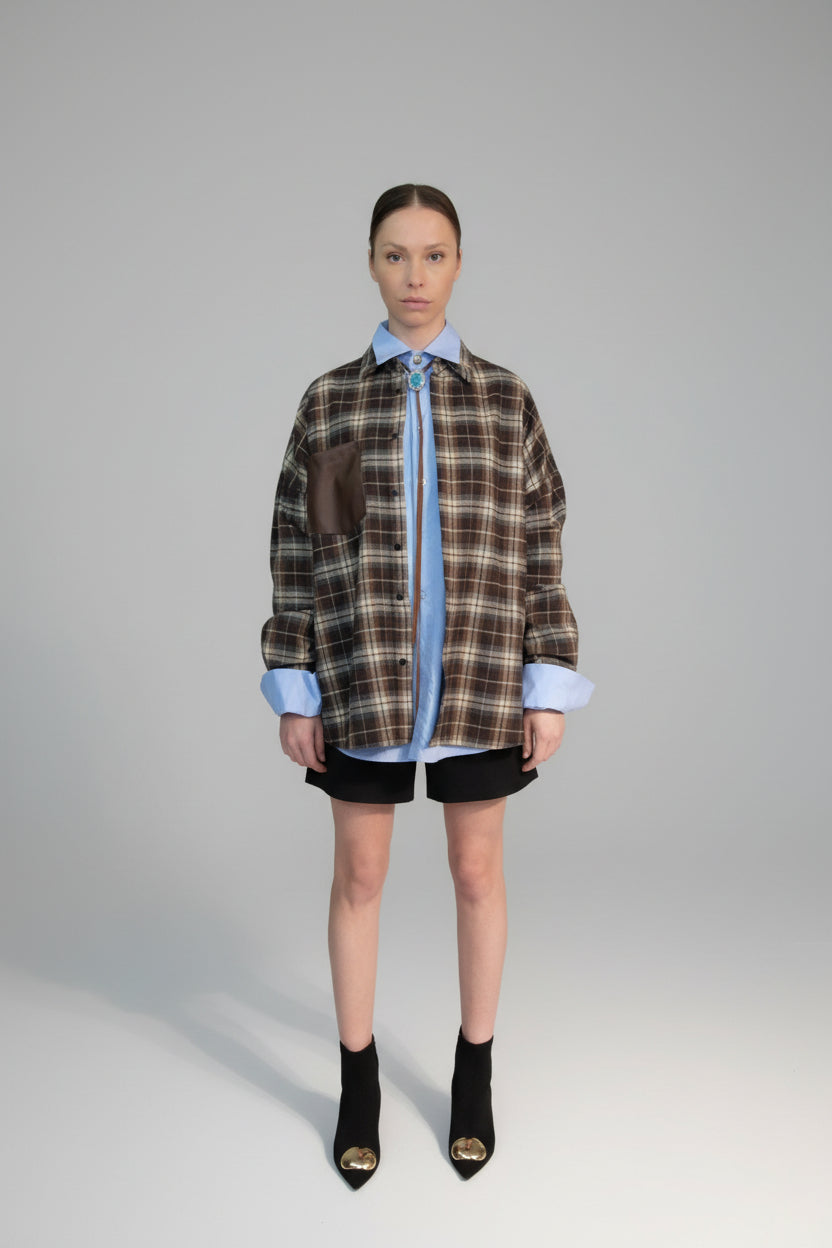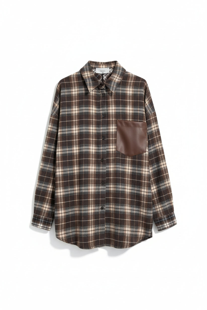 Myk og behagelig rutete skjorte med to ulike teksturer i stoffet på ryggen og mansjettene. Brystlomme i Chocolatefarget økoskinn som en stilfull detalj. Takket være leggene øverst på ryggen har skjorten en løs passform. Énstørrelse som passer perfekt til S, M og L.