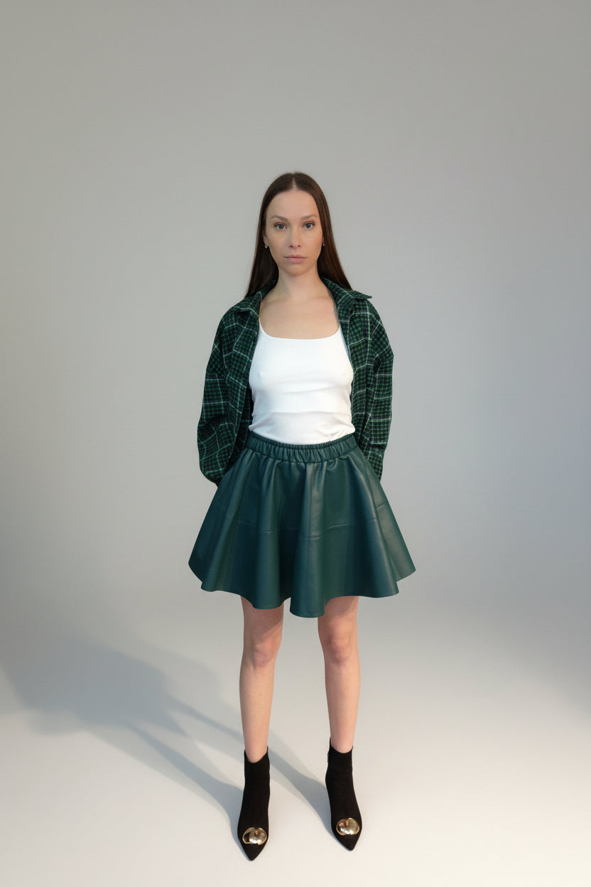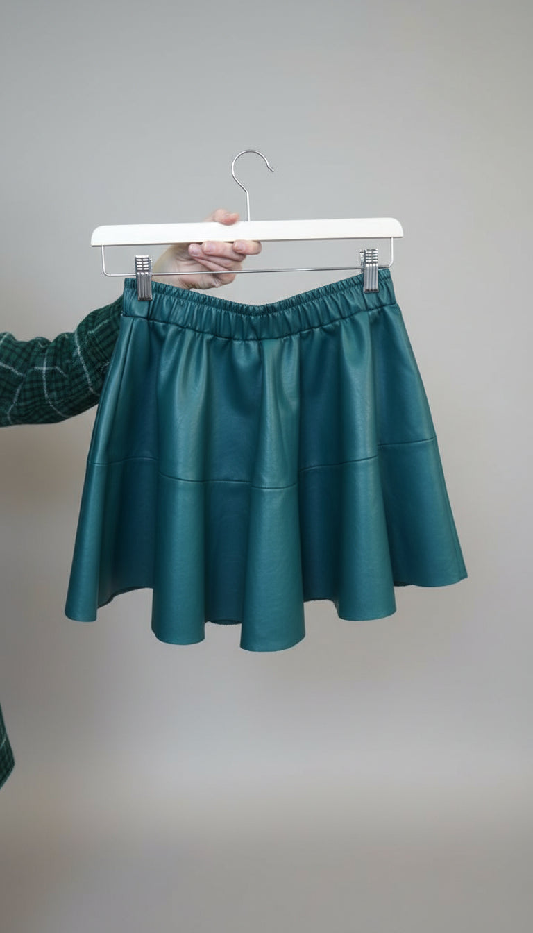 Solskjørt laget av tett og myk økoskinn med mikrofiberbase. I en rik og populær mørkegrønn farge. Elastisk midje, passer til størrelse S og M.