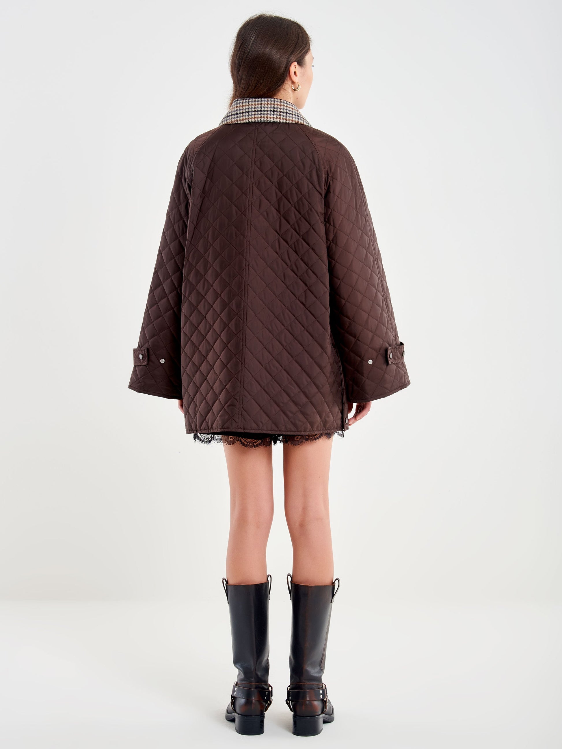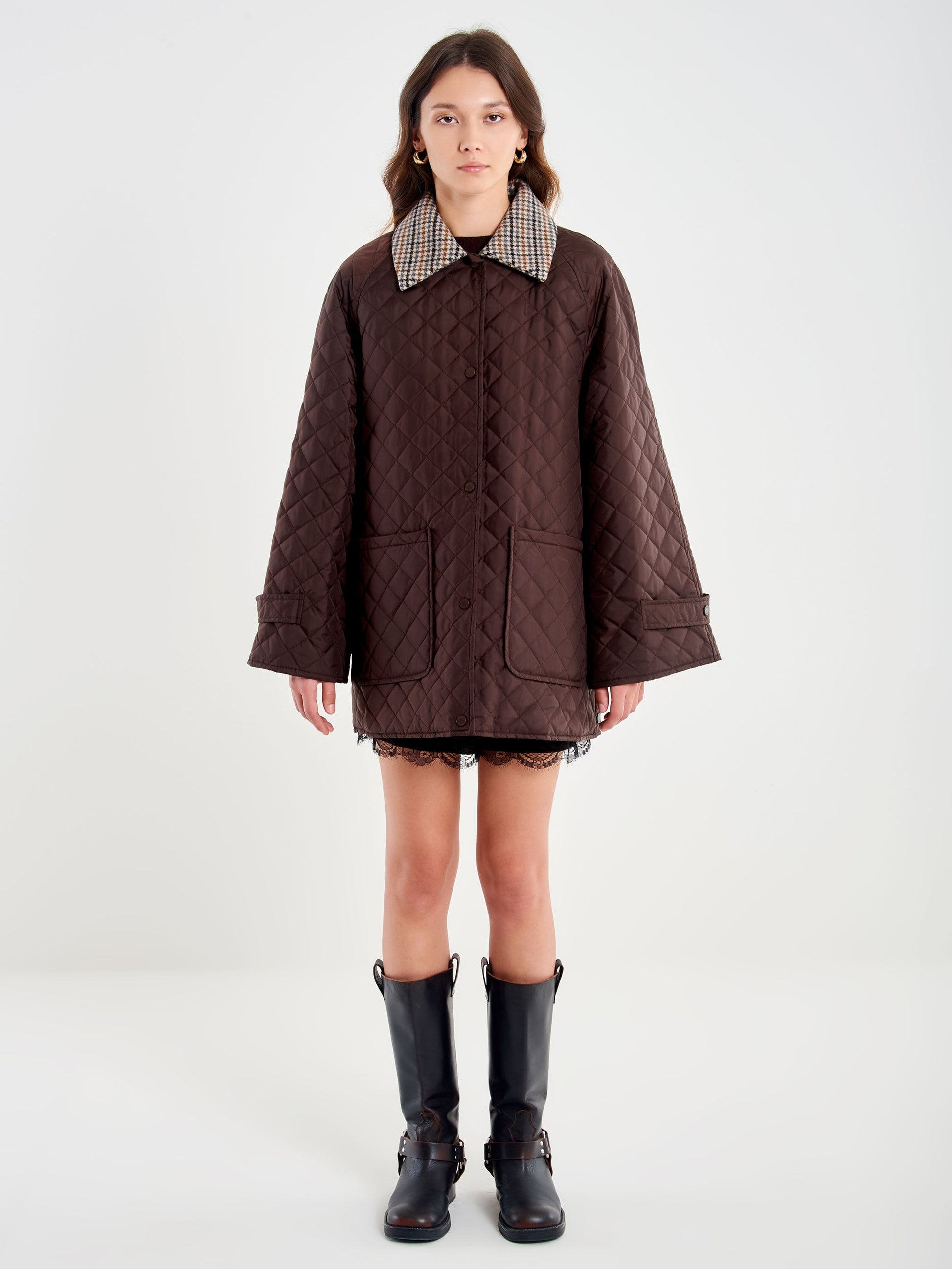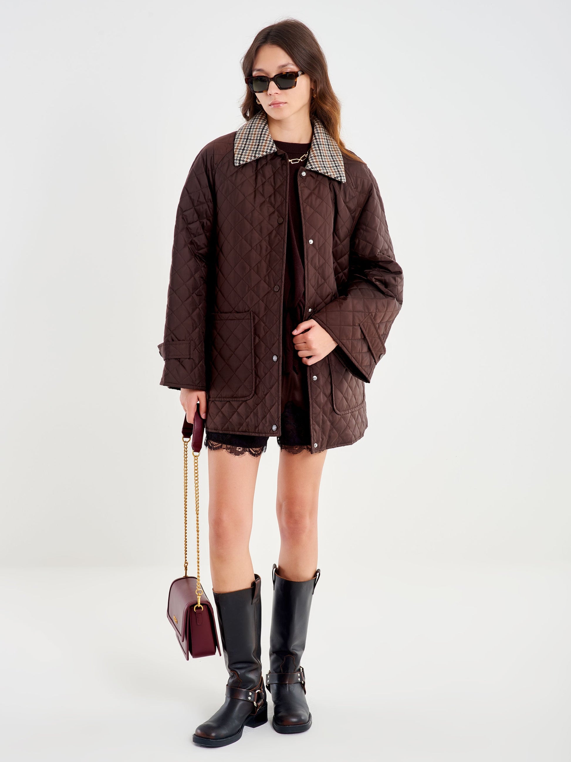 Vattert jakke med lange ermer og rutet krage. Epåletter på ermene lukkes med trykknapper. Påsydde lommer foran. Lukking med trykknapper foran.